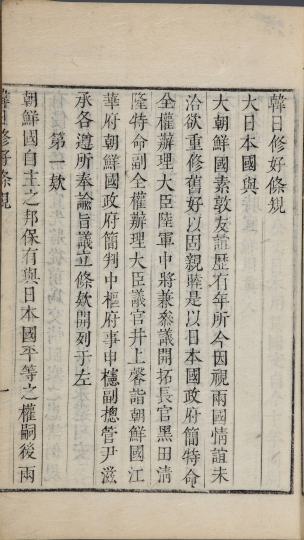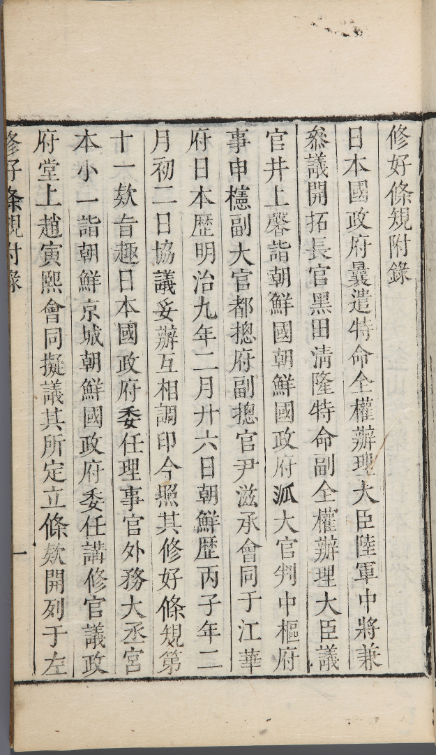This is an external affairs book published by the Foreign Ministry of Joseon, South Korea's forerunner to the current Ministry of Foreign Affairs. The book is split into two parts: upper and lower volumes. The Treaty of Ganghwa, signed between Joseon and Japan in February 1876, is included in the upper volume on display. The treaty was a typical unequal treaty in which Joseon was forced to open the ports of Busan, Wonsan, and Incheon to Japan and granted Japanese citizens extraterritoriality.