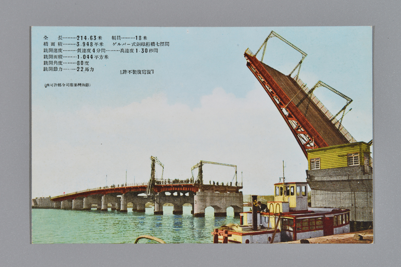 The Busan Bascule Bridge, completed in 1934, was a single-leaf bascule bridge that connected the southern part of Busanbu to the northwestern tip of Yeongdo Island. The postcard includes an image of the open bridge as well as pertinent information. This Bridge is now known as the Yeongdo Island Bridge.