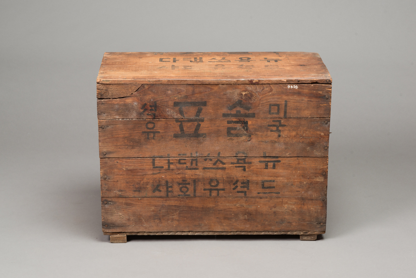 This is a box used to store oil in the 1940s. Its brands include "American Solpyo Oil" and "New York Standard Oil Company." The widespread availability of oil facilitated the popularization of oil lamps, and the common adoption of oil lamps significantly altered the Joseon people's evening lifestyle.